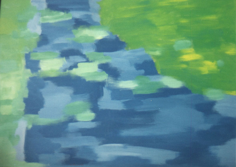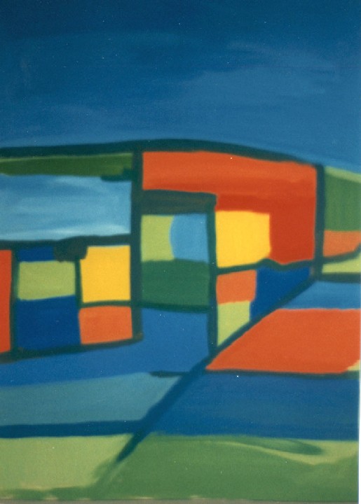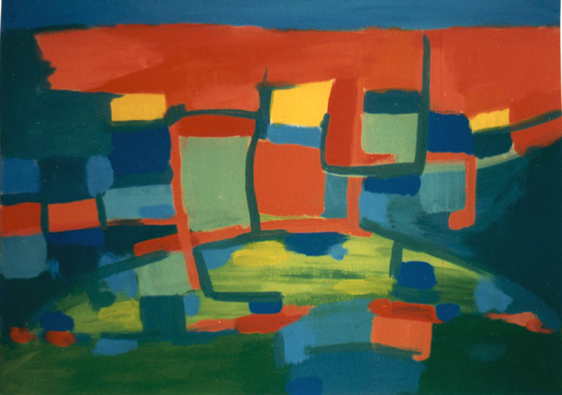 Waren die ersten Arbeiten noch eher klein (bis DIN A4) , so weitete sich nun das Format bis zu 50/70 cm. Was an den frühen Arbeiten noch dekorativ war, gewann nun eine Tiefendimension und Lebendigkeit. In den letzten beiden Jahren nun variiere ich Themen der Landschaft, indem ich teils auf die bewährten Flächen-kompositionen zurückgreife, teils in Fleckentechnik die Farben in ihrer eigenen Dynamik aufeinander wirken lasse. Dabei kommt mir die starke Pigmentierung von Acrylfarben sehr entgegen.